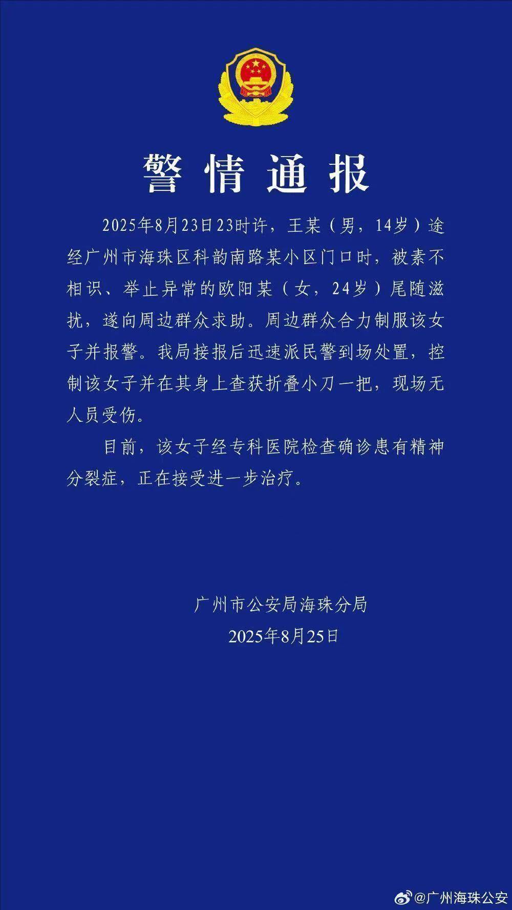 8月25日下午,广州市公安局海珠分局发布警情通报。通报称,2025年8月23日23时许,王某(男,14岁)途经广州市海珠区科韵南路某小区门口时,被素不相识、举止异常的欧阳某(女,24岁)尾随滋扰,遂向周边群众求助。周边群众合力制服该女子并报警。公安部门接报后迅速派民警到场处置,控制该女子并在其身上查获折叠小刀一把,现场无人员受伤。目前,该女子经专科医院检查确诊患有精神分裂症,正在接受进一步治疗。