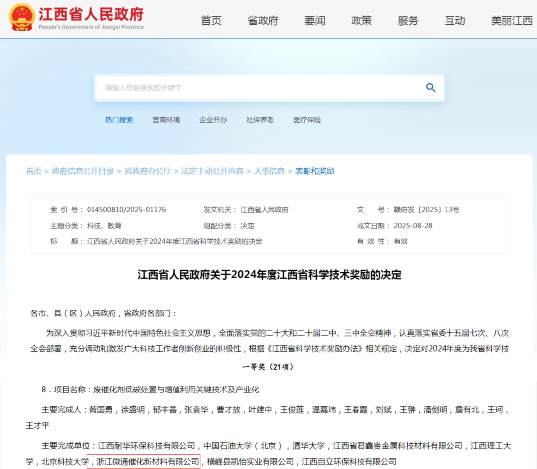 日前,江西省人民政府正式发布《关于2024年度江西省科学技术奖励的决定》,浙江省冶金研究院有限公司下属浙江微通催化新材料有限公司参与的《废催化剂低碳处置与增值利用关键技术及产业化》项目荣获江西省科学技术进步奖一等奖。